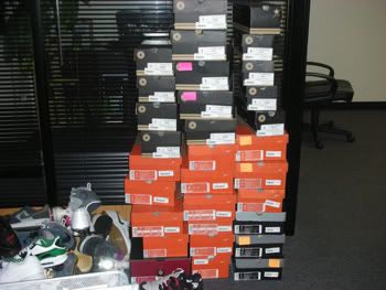 Haven't had much time to blog this week because we've received two months of shoe samples which naturally must go onto the website in a week. Generally, I process, photograph, edit, and put up between 30-40 pairs a week, but I think it was closer to 80 this week at a rate of about 15 new pairs a day. Talk about overload. Lest you doubt, this is what my office has looked like for most of the week.